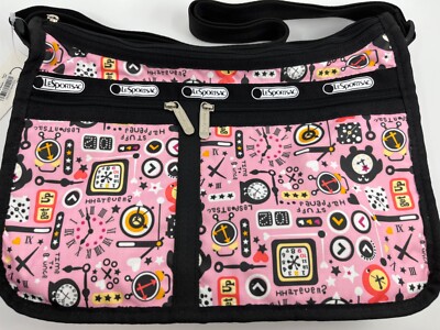 LeSportsac 7507 デラックス エブリデイバッグ + ポーチ “Tick Tock” ピンクの時計モチーフ 新品・未使用